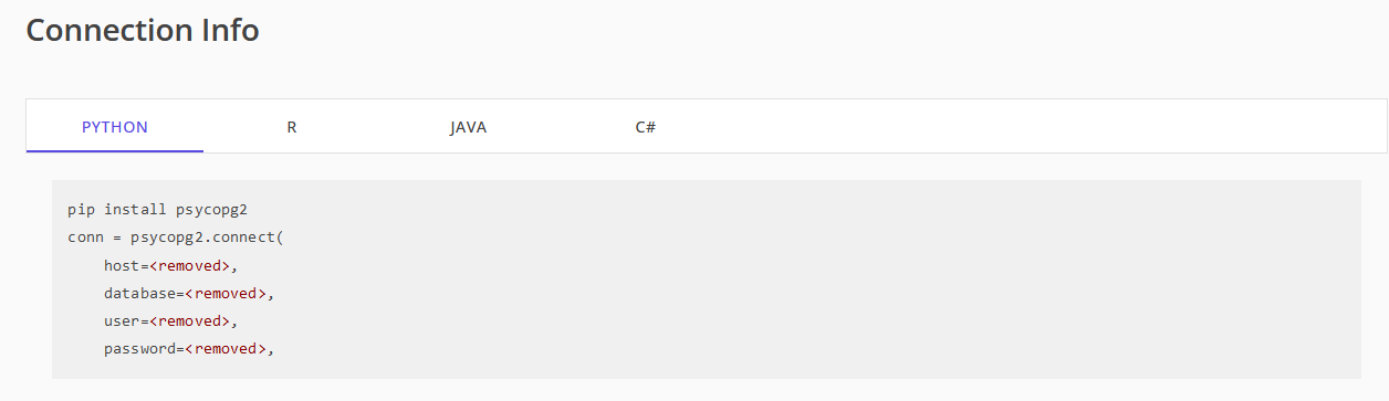 - After adding your IP address to the firewall rules, you can use the connection info provided for Databricks, Python, R, Java, and C#.